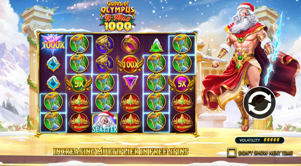 Gates of Olympus Xmas 1000 demo is an unconventional online slot from Pragmatic Play that integrates the spirit of Christmas with ancient Greek mythology. Zeus, who looms over the ruins of Olympus, assumes the primary role.
